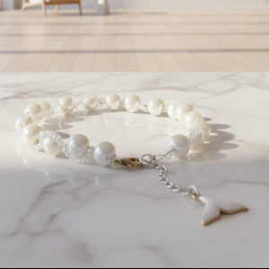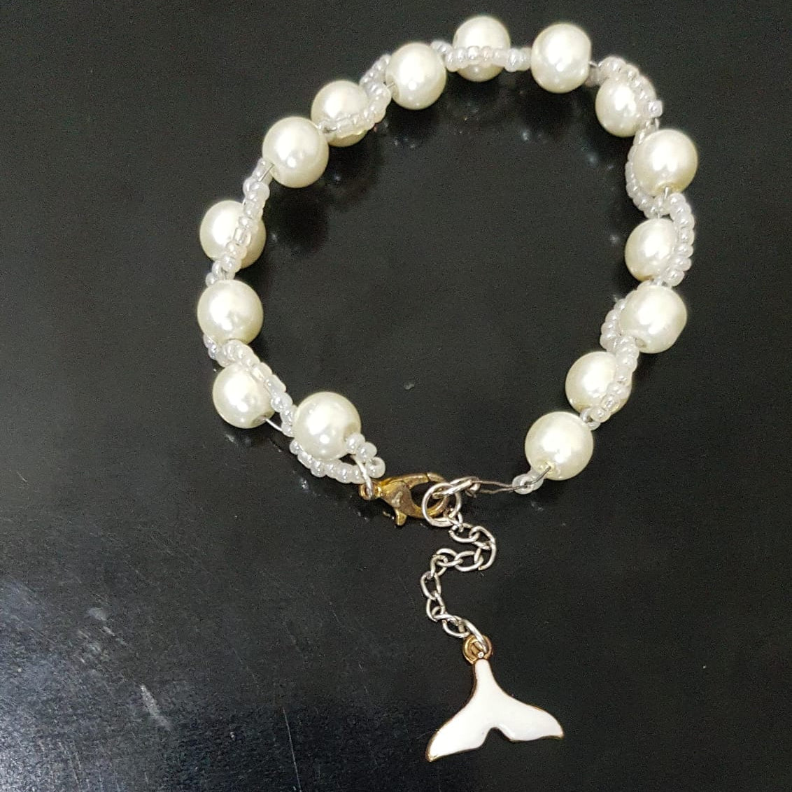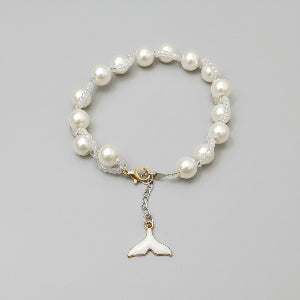 Pearl bracelet with a silver whale tail charm on a black background